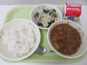 今日の給食は、麦ご飯、牛乳、牛肉カレー、海藻サラダ、いちごでした。