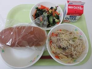 今日の給食は、黒糖パン、牛乳、炒めビーフン、中華風わかめサラダでした。
