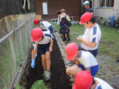 今日は、3年生で西米良の伝統野菜、糸巻き大根の種まきを行いました。