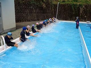 3校時に1・2年生のプール開きがありました。1年生にとっては小学校初めてのプール、小プールに入りました。友達と水を掛け合ったり、水の中に顔をつけてじゃんけんをしたり、クラゲやワニになって浮いたりしました。これから夏休みにかけて、水泳の学習が続きます。