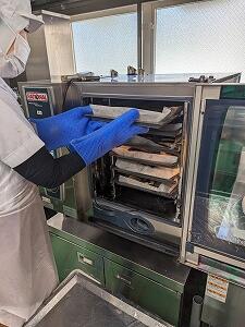スチームコンベクションオーブンを使った鯖の塩焼きは、西米良村では初めて提供しました。大きなタライに鯖を入れて料理酒と塩をまぶしまぜます。家庭での調理とは違い、大量調理なのでこの塩の量や焼き加減も難しいです。塩の量は計算し、中はふんわり、外はカリっと仕上がるようにスチームコンベクションオーブンの蒸気の量・温度・時間を事前にしっかり打ち合わせをしたのでおいしく仕上がりました。