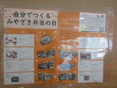 今日は、掲示物について紹介します。まず自分で作るみやざき弁当の日の掲示物を紹介します。宮崎県では、自分で作るみやざき弁当の日という取り組みがあります。春にあった遠足で1~4年生に自由参加で取り組んでもらいました。(56年生は宿泊学習でした)宮崎県スポーツ振興課から募集のあった笑顔つながる「みやざき弁当の日」写真展にも応募していただいたご家庭もありました。