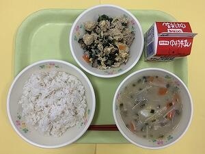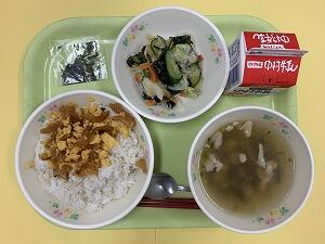 今日の 投稿日時 : 2022/09/12 nishimera カテゴリ:今日の出来事 9月12日(月) 【バラエティ給食】 減量いりこ菜めし、鮭の塩焼き、チーズチキン大葉巻、切干大根入り厚焼き玉子、ポテト、マカロニサラダ、ミニトマト、ぶどう、セレクトデザート、牛乳