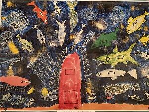 色を重ねながら深い海の様子を表現し、カラフルな魚と対比させています。