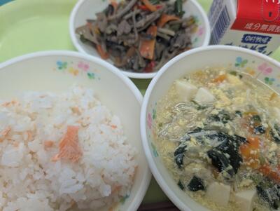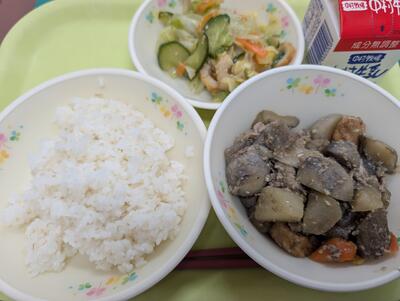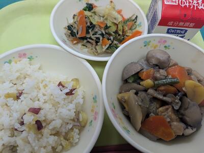 旬の味覚をたっぷり使った、食欲の秋にぴったりの献立です。 ほくほく甘いさつまいもごはんと、栗が入った根菜の旨み豊かな煮物で季節を味わうことができました。 栄養満点の給食で、午後からも子どもたちは元気にすごしていました。