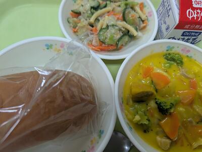 色とりどりの野菜が入り、見た目も味も楽しめる献立でした。さつまいも蒸しパンは、給食室でひとつひとつ手作りです(^^)/