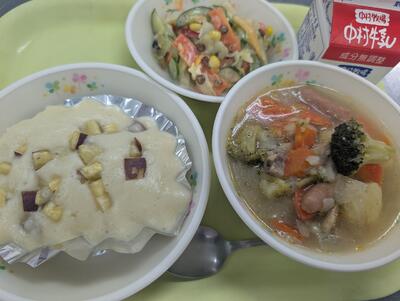 11月4日の給食は、さつまいも蒸しパン、牛乳、ポトフ、チーズサラダでした。