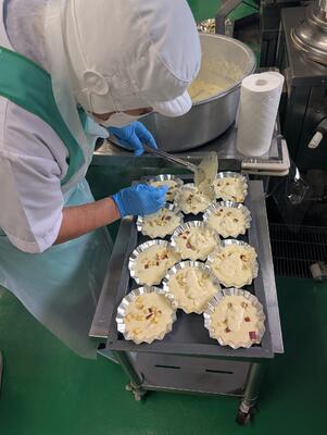 今日は、調理員さんたちが朝早くから子どもたちを喜ばせようと準備をしていました。 1枚目の写真は、「子どもたちは、喜んでくれるかなー?」と緊張しながら待つ調理員さんたちの様子です。