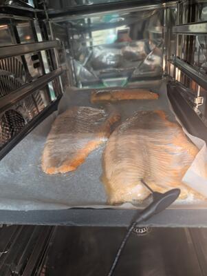 西米良サーモンは知っている子が多い一方、奥日向サーモンは知らない子が多かったので、この給食は “新しい西米良の魅力” を知るきっかけにもなりました。ただし、奥日向サーモンを一人1切れ提供するには、まだまだ予算との折り合いがつきません。そこで、オーブンで焼いて まぜこみごはん にすることで、全員が味わえるよう工夫しました。