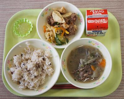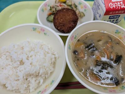 11月6日の給食は、麦ごはん、牛乳、煮しめ楽コロッケ、酢の物、わかめのみそ汁でした。