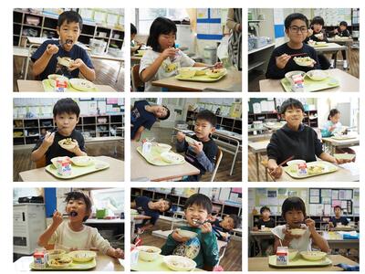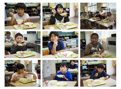 この日は、4年生が大豆の収穫を予定していたので、大豆が変身する食材をたっぷりつかったメニューでした。残念ながら、大豆の収穫は延期になりましたが、4年生の子どもたちと大豆が変身する食材を食べながら確認しました。大豆、みそ、豆乳、しょうゆ、油揚げ、豆腐…おいしく学んでいました。