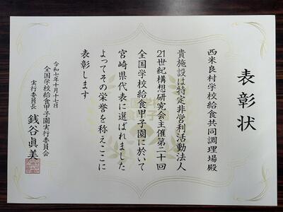 栄養教諭の先生をはじめ、調理員さんなど、多くの方の力で完成した給食です。学校給食甲子園は3次審査で惜しくも敗退しましたが、宮崎県代表として素敵な賞状をいただきました。