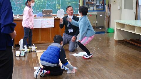 15日(金)青空の下で紙飛行機を飛ばす6年生。