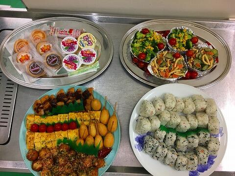小学校5、6年生の給食は、先週バラエティ給食を実施しました。メニューは「わかめごはん、赤かぶ青菜ごはん、魚そうめん汁、ローストンカツ、千草焼、揚げたこやき、アメリカンドッグ、ブロッコリーサラダ、マカロニサラダ、ミニトマト、デザート」。