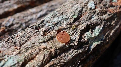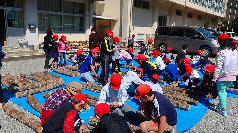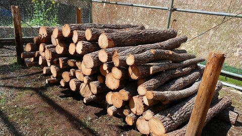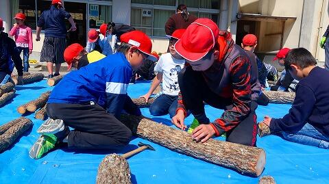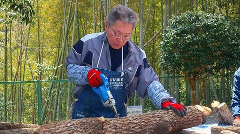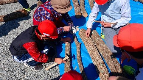 立派なクヌギの原木にドリルで穴をあけてもらい、