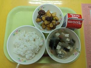 今日の給食は、麦ごはん、牛乳、肉じゃが、ちりめんの和え物でした。