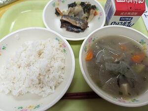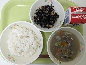 今日の給食は、麦ごはん、牛乳、切干大根の煮物、石狩汁でした。