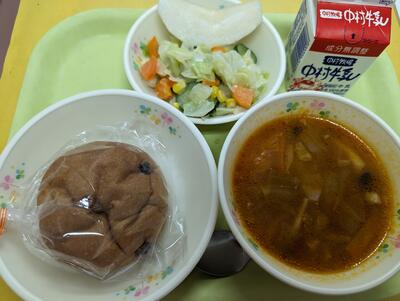 今日の給食は、おちゃっぱ蒸しパン、ポトフ、ブロッコリーのサラダでした。