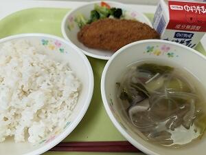 今日の給食は、麦ご飯、かぼちゃコロッケ、そえやさい、吉野汁でした。