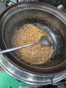 チキン南蛮は、一度揚げててから味が均一につくように釜に入れて甘酸っぱいたれで味付けをしました。