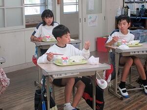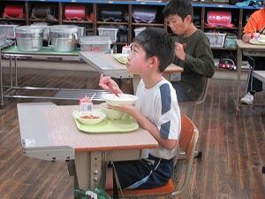 写真は、自分が決めた目標をチャレンジしている給食の時間の様子です。