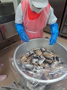 スチームコンベクションオーブンを使った鯖の塩焼きは、西米良村では初めて提供しました。大きなタライに鯖を入れて料理酒と塩をまぶしまぜます。家庭での調理とは違い、大量調理なのでこの塩の量や焼き加減も難しいです。塩の量は計算し、中はふんわり、外はカリっと仕上がるようにスチームコンベクションオーブンの蒸気の量・温度・時間を事前にしっかり打ち合わせをしたのでおいしく仕上がりました。