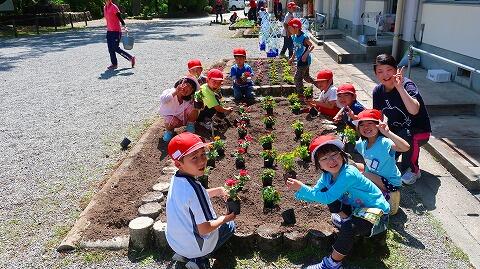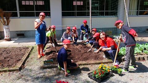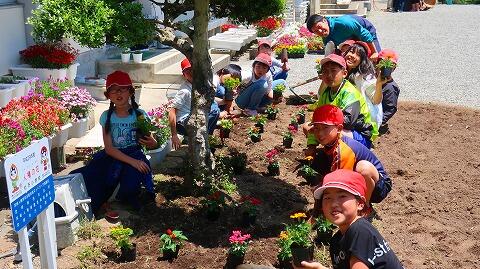 前もって整えていた花壇に、新しい苗を大事そうに植える子どもたち。
