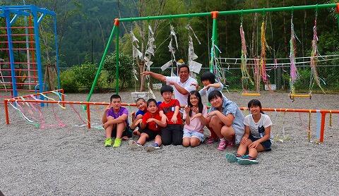 屋外のブランコを使用しながら、創作作品を手掛ける子どもたち。