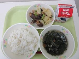 今日の給食は、麦ご飯、牛乳、厚揚げの中華煮、汁ビーフンでした。