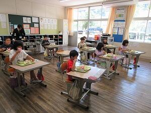 子どもたちからは、『久しぶりの給食だ~!』という声が聞かれ新しい友達や新しい担任の先生たちととても楽しそうに給食を食べていました。