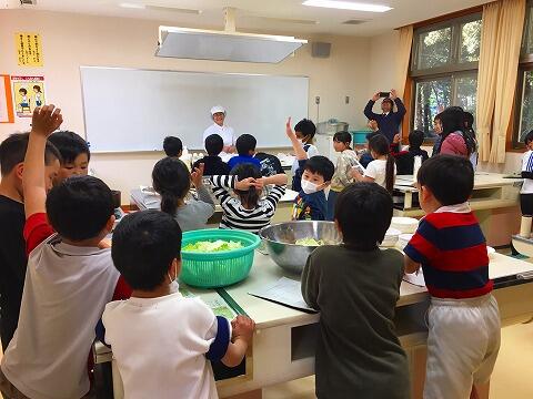 調理時間、ごはんを配缶する人、みそ汁を作る人、揚げ物をする人、揚げた椎茸や鶏肉を南蛮酢にからませ個数を数えて配缶する人、添え野菜を和える人…と調理員さん、栄養教諭の5人体制で作業を進め、時間もかかり、大変な作業が続きましたが、給食時間の「とってもおいしい!」の声に、疲れが吹っ飛んでいきました。