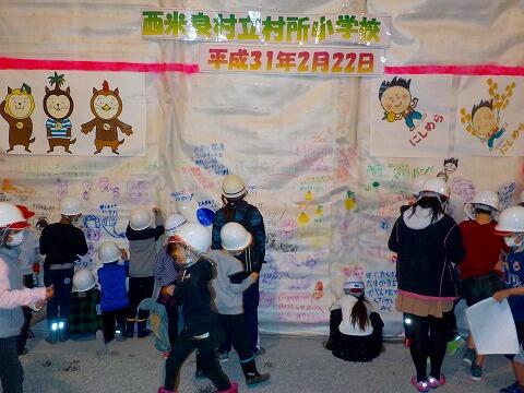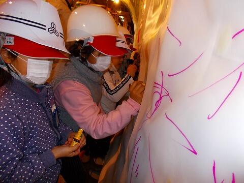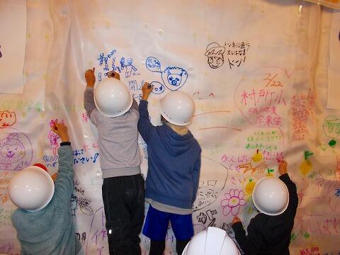 工事過程の説明後、防水シートに様々なメッセージなどを、