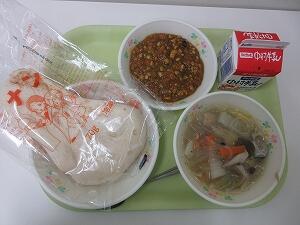 今日の給食は、ナン、牛乳、ドライカレー、マロニーのスープでした。