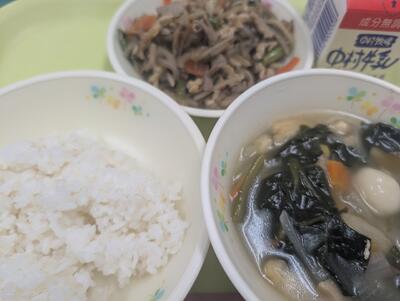 3月25日の給食は、麦ごはん、牛乳、れんこんきんぴら、しらたまだんご汁でした。