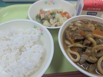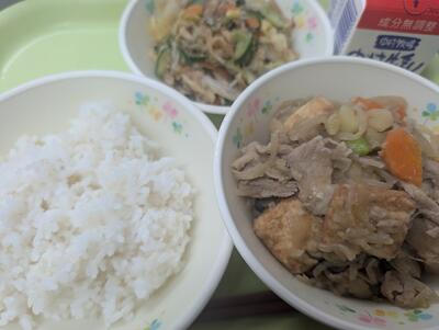 3月19日の給食は、麦ごはん、牛乳、肉じゃが、キャベツの和え物でした。
