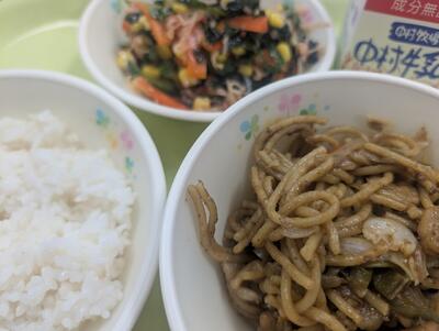 今日の給食は、麦ごはん、牛乳、焼きそば、中華風わかめサラダでした。