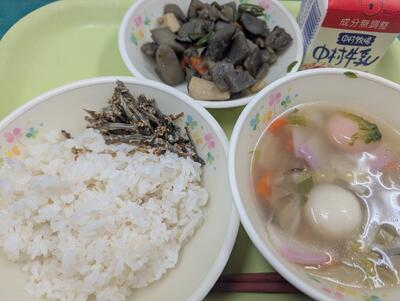 今日の給食は、麦ごはん、牛乳、田作り、筑前煮、七草汁でした。