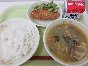 今日の給食は、麦ご飯、牛乳、ホキフライ、キムチ汁でした。