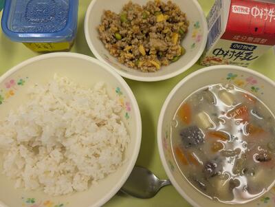 今日の給食は、麦ごはん、牛乳、とりそぼろ丼、さつま汁でした。