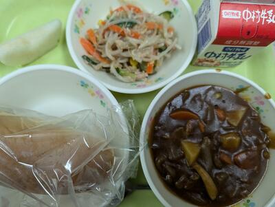 今日の給食は、コッペパン、牛乳、ブラウンシチュー、ツナサラダ、梨でした。