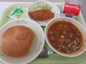 今日の給食は、バーガーパン、牛乳、白身魚のフライ、キャベツ、タルタルソース、チリコンカンでした。