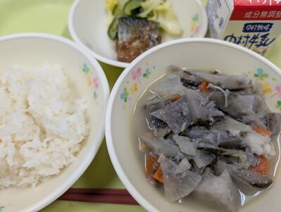 2月26日の給食は、麦ごはん、牛乳、さばの生姜煮、添え野菜、けんちん汁でした。