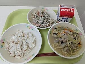 今日の給食は、梅菜ごはん、牛乳、ちゃんぽん、ごぼうのサラダでした。