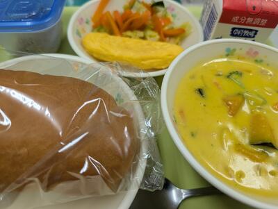 今日の給食は、コッペパン、牛乳、オムレツ、添え野菜、かぼちゃポタージュでした。
