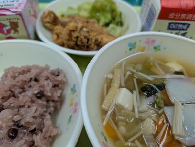 今日の給食は、赤飯、牛乳、とりのからあげ、添え野菜、すまし汁、お祝いケーキでした。