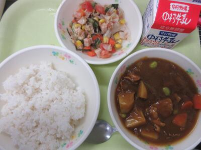 今日の給食は、麦ごはん、牛乳、猪肉カレー、元気サラダでした。
