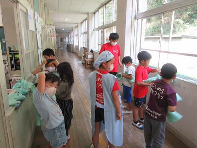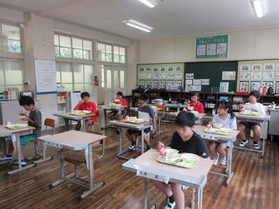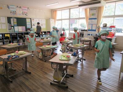 1、2年生の給食当番の様子です。毎日とても上手に自分たちで協力して給食の準備をしています。1年生には、5、6年生がお手伝いに来てくれて準備や給食着のたたみ方などのお手伝いをしてくれます。とても素敵で頼もしい高学年です。