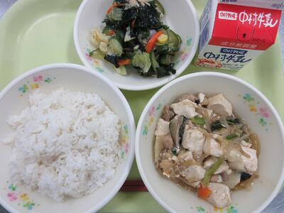 今日の給食は、麦ごはん、牛乳、豆腐の中華風煮、中華風わかめサラダでした。