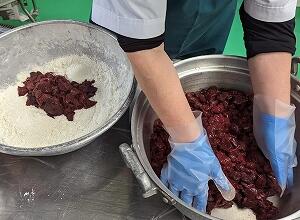 最後に大きな釜でたれと一緒に混ぜ合わせできあがりです。
