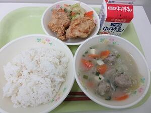 今日の給食は、麦ご飯、牛乳、とりのから揚げ、甘酢和え、ごぼう団子汁でした。